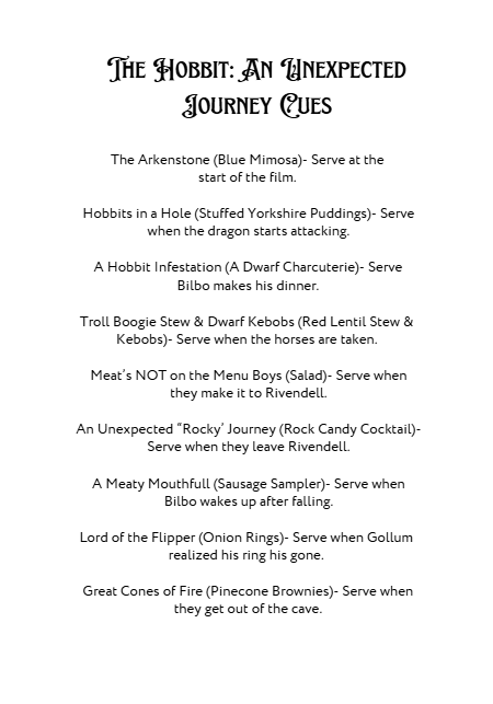 These are the cues I used during the movie night so I knew when I had to get the next dish ready to serve.