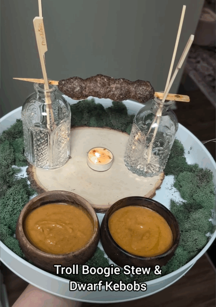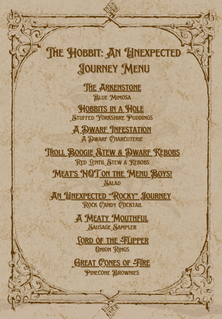 For the Dwarf Kebobs, I served this Kebab Recipe, but on a stick. Any Kebob or Kebab recipe will work for this joke. The important thing is that you serve it on a stick so you can hang it up over a little tea candle to resemble the scene where the Dwarves are being roasted.