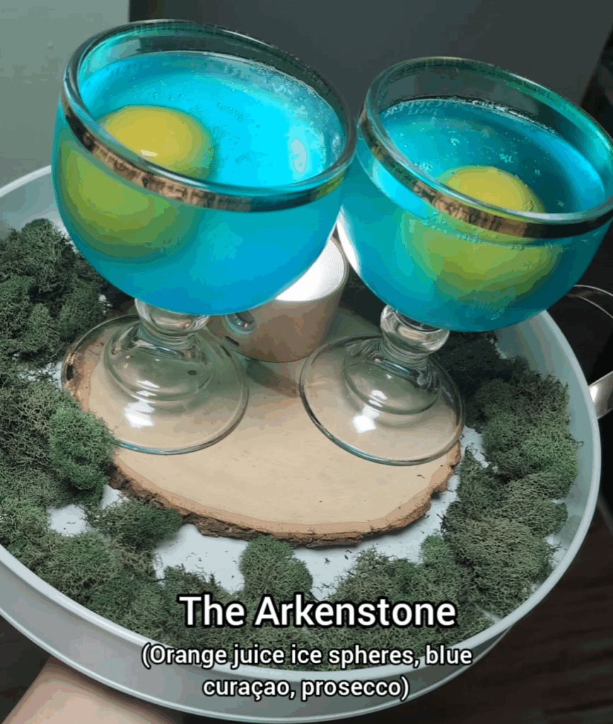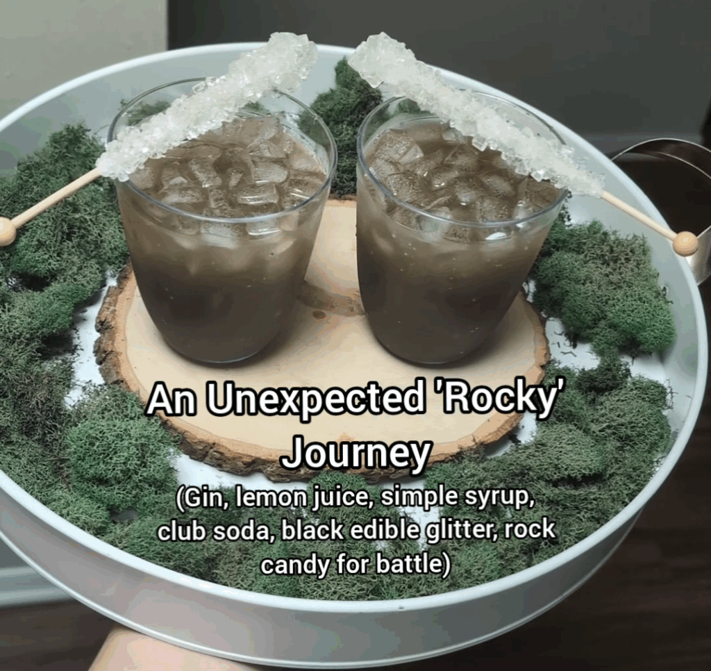 For this drink, I wanted to include an interactive element. I served it with rock candy so we could battle like the Stone Giants. I also wanted the drink to match the dark atmosphere of the scene, so I added black edible glitter to turn the drink greyish.