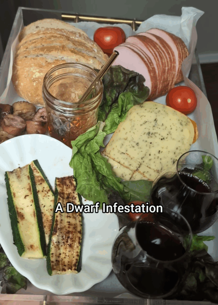 I served a small loaf of bread (sliced), a sliced quarter of ham (24oz), herb cheese, assorted pan-fried sausage (same sausage I used for “A Meaty Mouthful”), grilled zucchini, honey, tomato and lettuce garnish (reused for salad), and a small glass of wine to match the small drink Gandolf was handed. Lol!