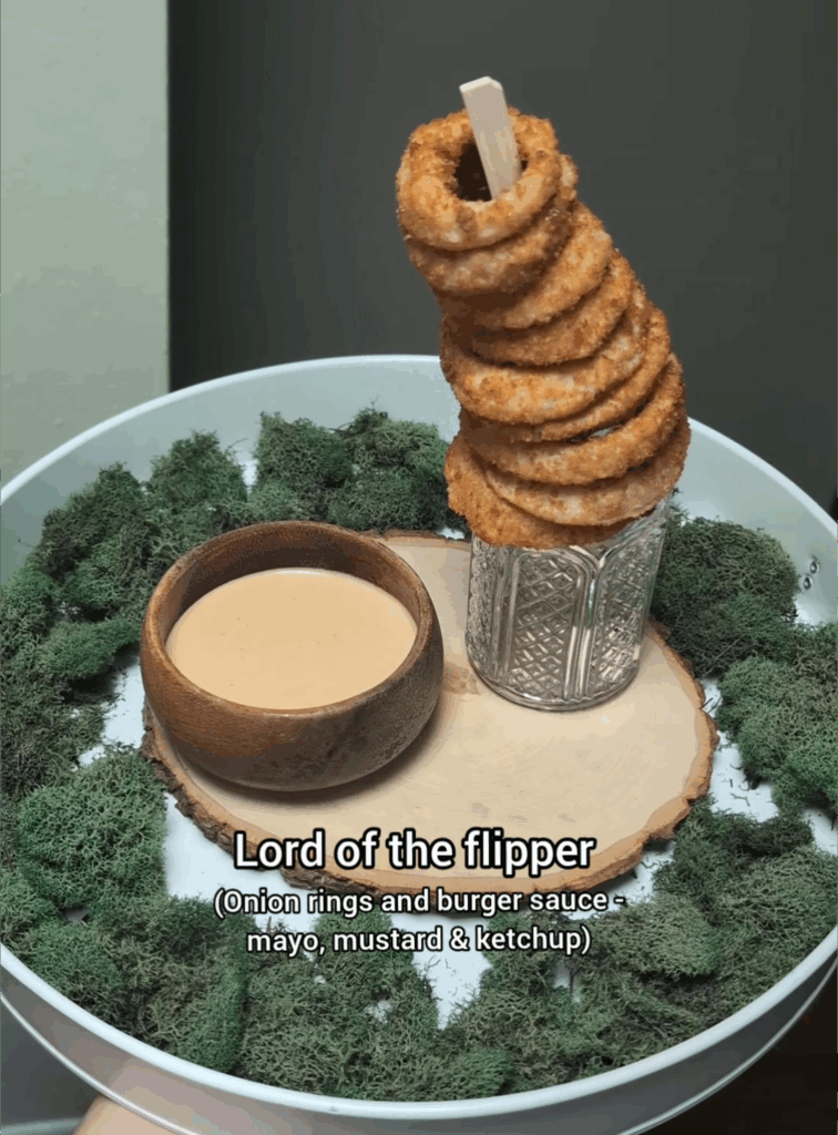 I named this dish “Lord of the Flipper” because if you notice, the ring slides on Bilbo’s middle finger. There is another layer to this name, though. If you have watched the behind-the-scenes of the making of The Hobbit, you’ll be familiar with the funny lore. Specifically, the actor of Bilbo, Martin Freeman, would constantly flip the camera off while filming The Hobbit. He truly is The Lord of the Flipper. LMAO!