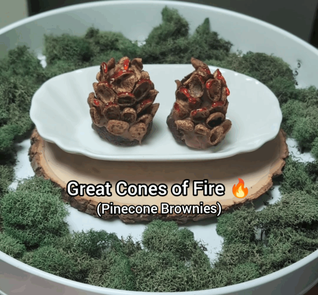 For this last dish, I chose to serve “pinecone brownies of fire” to resemble the pinecones they use to defend themselves in the last climactic scene of the movie. This is the recipe I used. I don’t know how she got them to look so neat, but even messy, like mine, looked cute and got the point across.