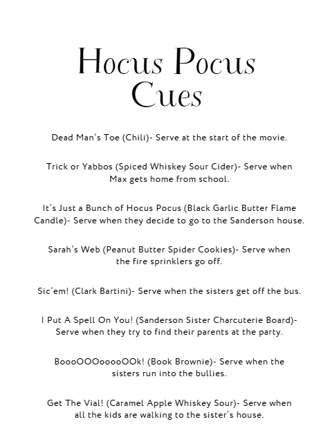 These are the cues I used during the movie night so I knew when I had to get the next dish ready to serve.