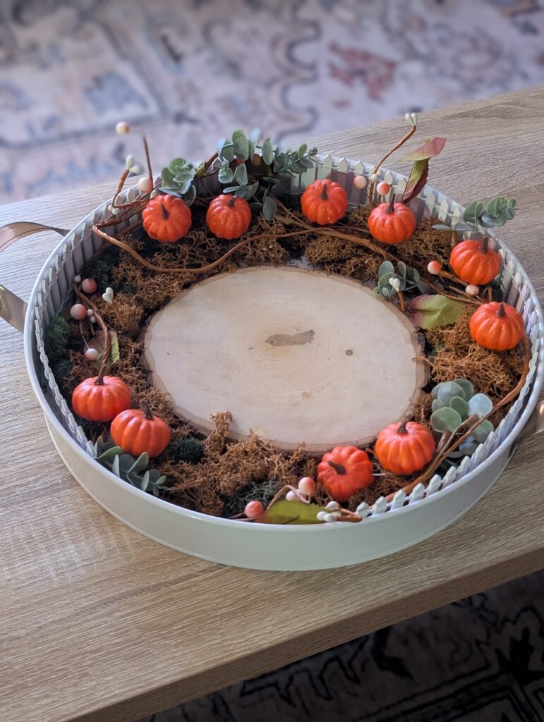 Serving Tray Decorations– I went to my local craft store, Michael’s, and bought a wooden log cutting, brown and green moss, a pumpkin patch garland, and a mini white picket fence. They usually have good sales, so check it out and have fun decorating your tray!