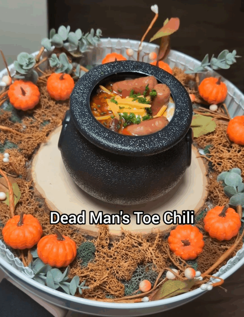 This is the Chili Recipe I used. I topped it with cheddar cheese, sour cream, and green onions. I served the chili in this Cauldron to mimic the sister’s potion. To tie in the “Dead Man’s Toe” they add to the potion, I also included Lit’l Smokies sausages. These sausages are precooked so to prepare them, I just pan-fried them for a few minutes until they were lightly browned. Add them to the chili and you’ve got a Dead Man’s Toe Chili!
