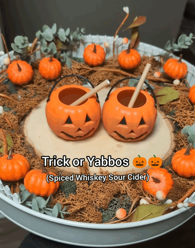 When it’s time to serve, shake the jar very well and evenly pour the drink into your Mini Trick-or-Treat Baskets. If you would like to go the extra mile, you can shake the jar with some ice in it and then strain the liquid with a fine mesh strainer over your baskets. This gets the drink extra cold and removes the cinnamon residue. It’s not a necessary step, but it does make the drink better.
