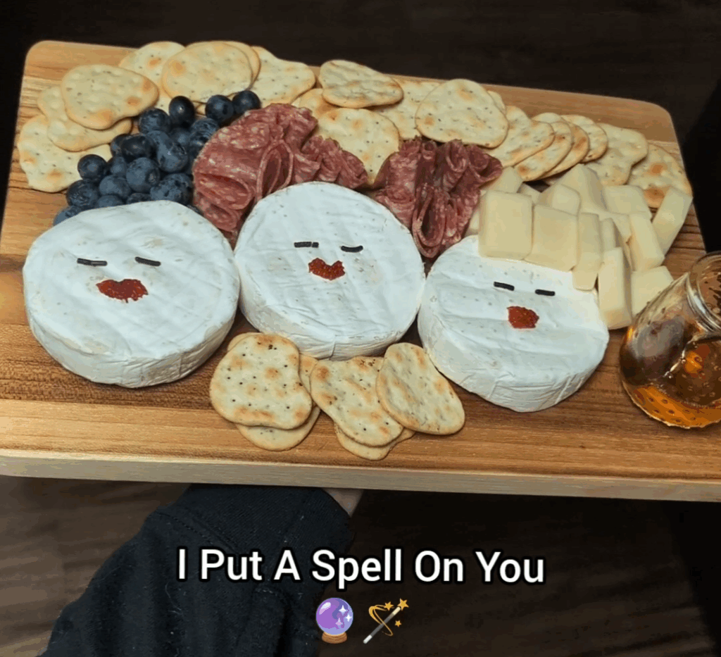 To make it, you will need three small Brie rounds for the heads. I used strawberries for the lips and chocolate sprinkles for the eyes. For Mary’s hair, I used blueberries shaped at an angle. For Winifred, I used salami rolled up to match her to buns, and for Sarah, I used white cheddar to match her blond hair. I then placed crackers around them to keep the hair in place, and I also served honey to drizzle on top.