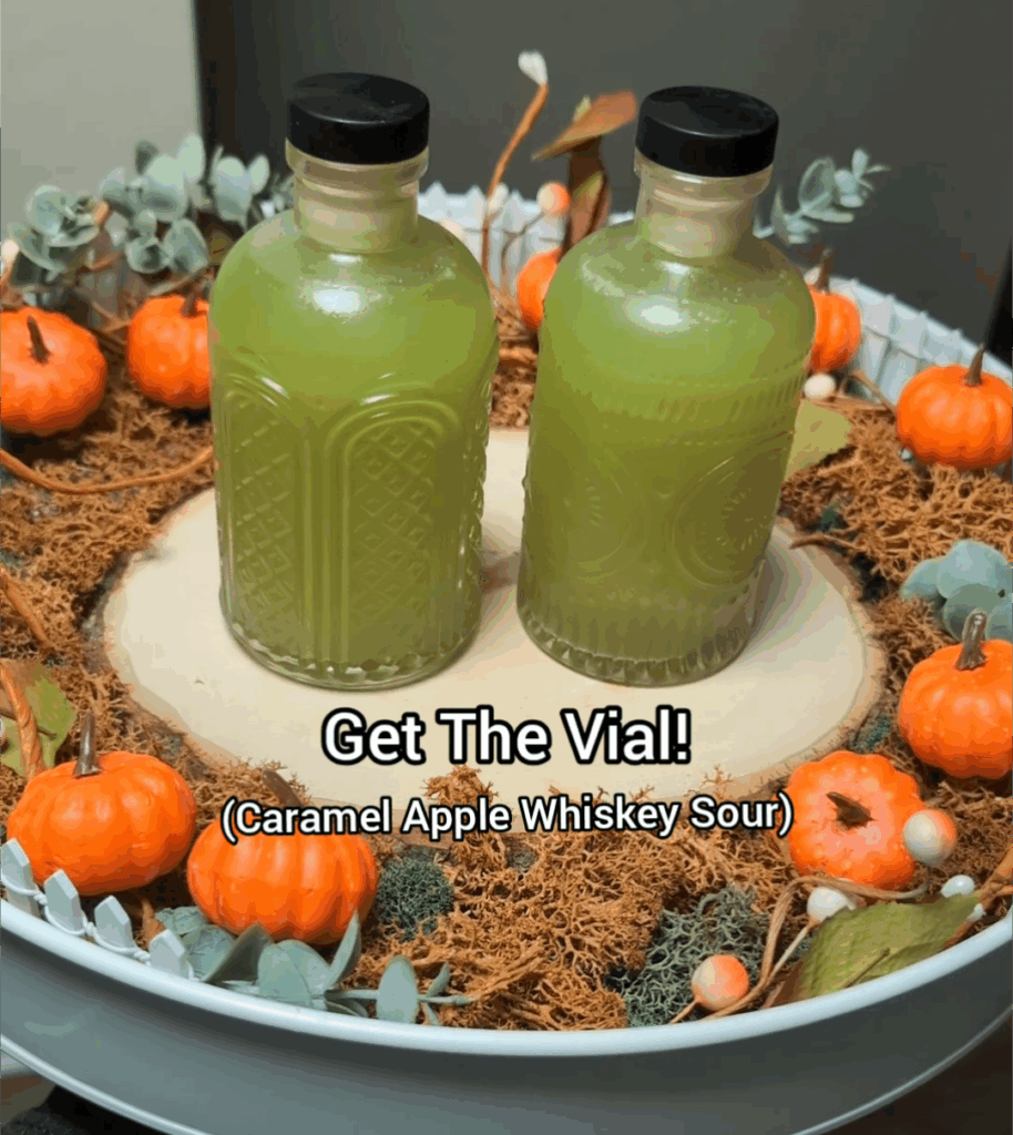Add your whiskey, sour apple Schnapps, and caramel mix to your vials with a cork. The vials come with a funnel, so use that to add the ingredients. Shake and store them in your refrigerator. I like doing this the day before movie night to save time the day of. It also gets the drinks cold for serving.