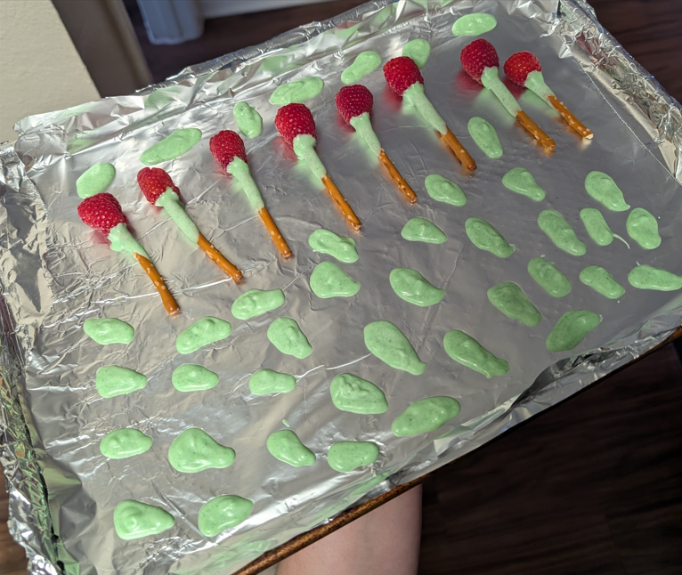 I first started by making the roses and leaves. Have a parchment or aluminum foil covered tray ready, along with your pretzel sticks and washed raspberries. Start by melting your chocolate. Add your melting chocolate and coconut oil to a microwave safe container. Microwave for 30 seconds. Then stir and microwave in 15-second increments, stirring in between. You have to limit the amount of heat the chocolate receives because it’s high in sugar, which causes it to burn faster.