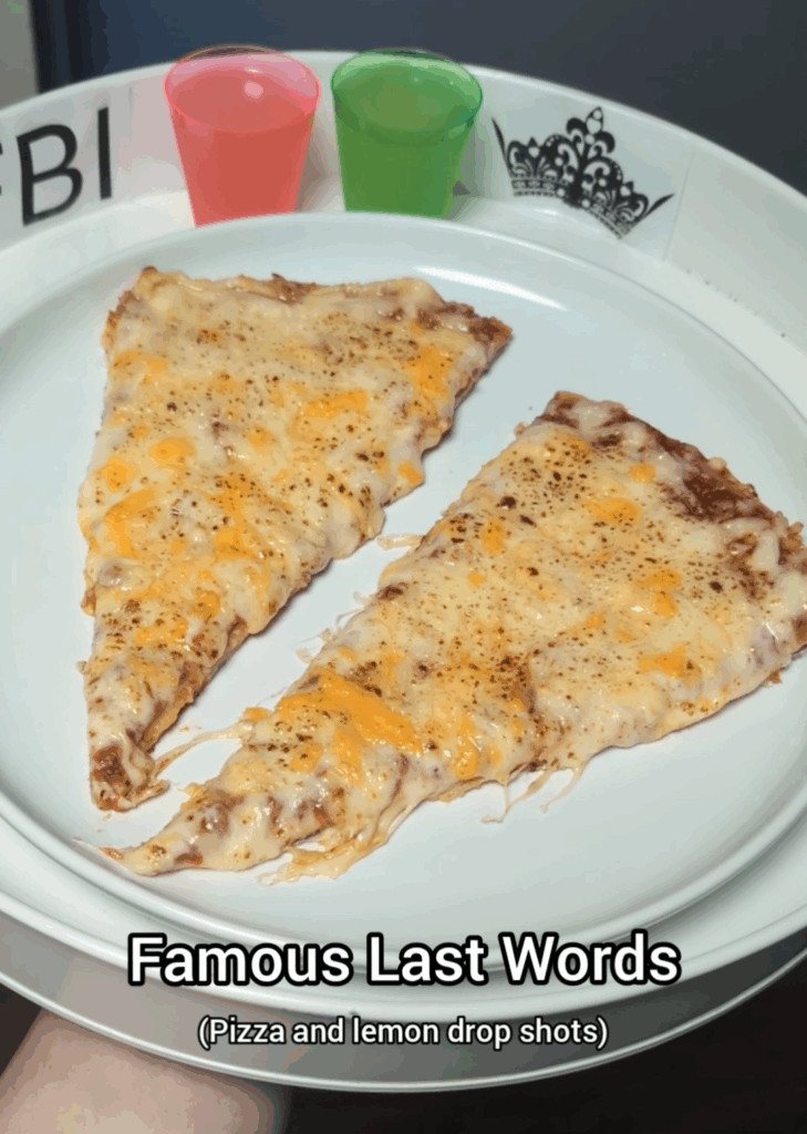 I decided to serve pizza and neon shots to represent this scene. I planned this movie night and filmed it in a very short amount of time, so I didn’t have time to get the neon tubes delivered from Amazon. I went to several different stores and couldn’t find them, so I settled on the neon shot glasses. If I had more time, these are the ones I would have ordered because they are flat at the base.