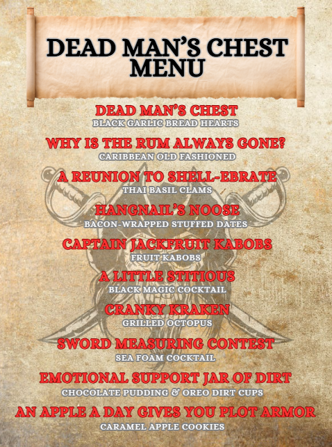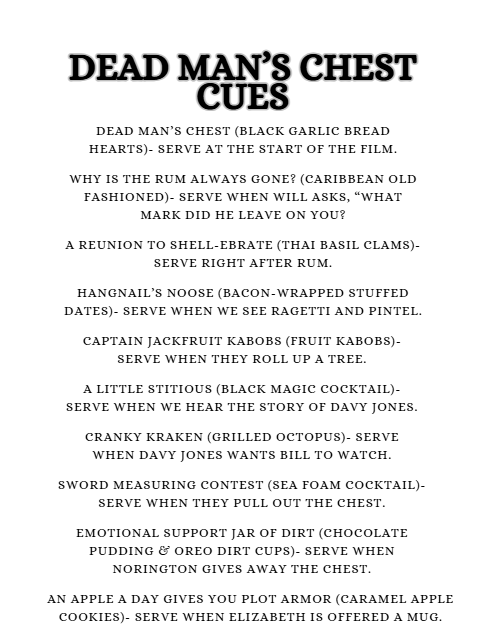 Here is a list (with links) of all the equipment and decorations I used for my Pirates of the Caribbean: Dead Man’s Chest Culinary Movie Night. I would be incredibly grateful if you used my links. I will make a little commission, and that would really help with the cost of the website and related expenses. You can find my full Amazon List here!