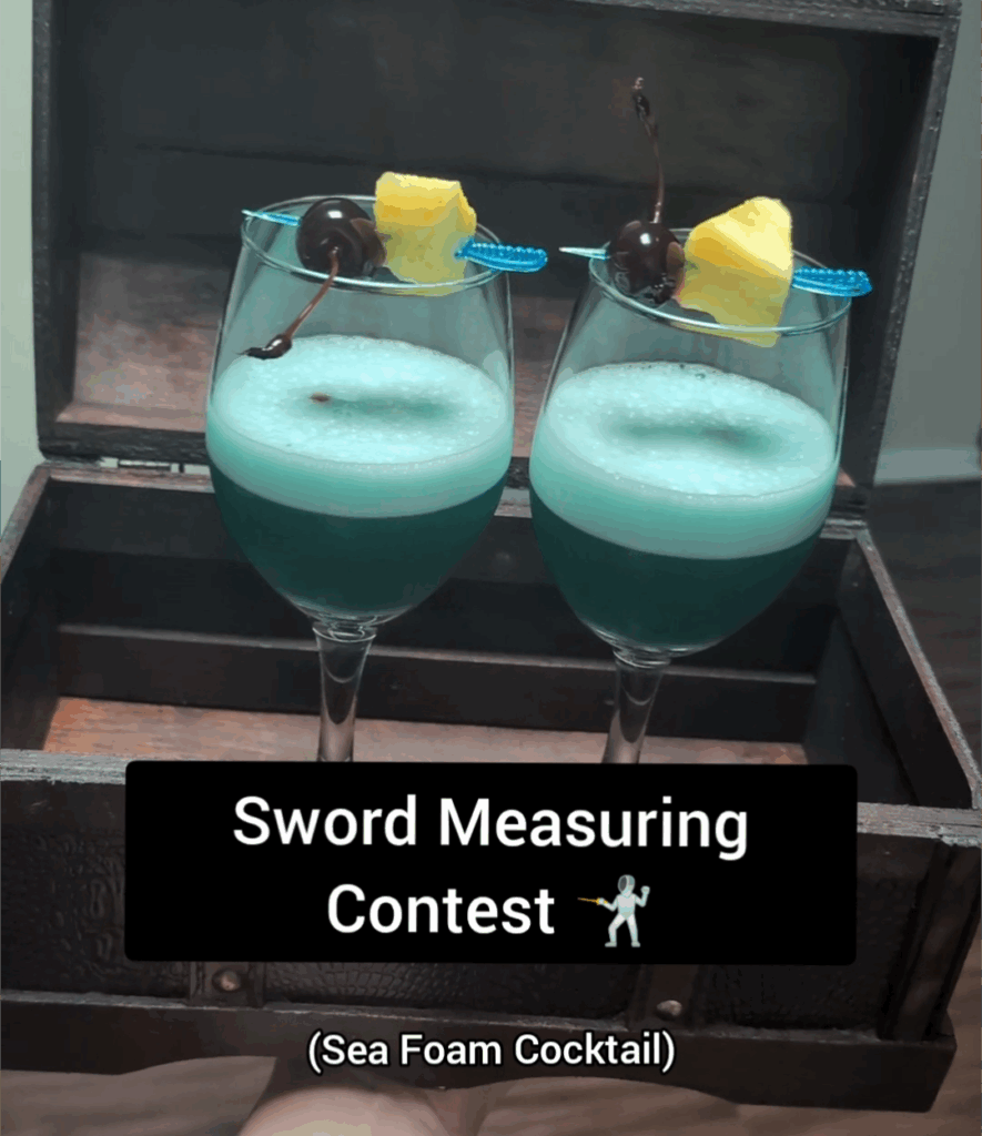 I named this drink after the funny scene where the men are all too busy fighting because of their hatred, pride, and greed to be aware of their surroundings. I decided to serve a cocktail that looks like sea foam to replicate the beautiful shore this scene takes place on.